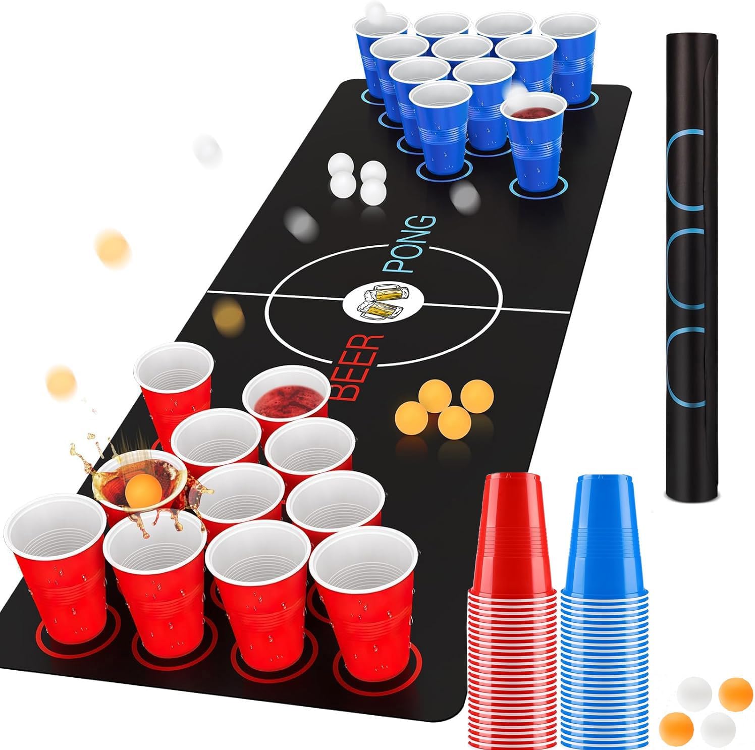 Deze Bier Pong kit bestaat uit een fantastische 180 cm x 60 cm lange bierpong-mat, 32 bierpongbekers (rood x 16 + blauw x 16) en 8 tafeltennisballen.